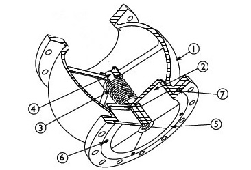 静音式止回阀主要由阀体、阀座、导流体、阀瓣、轴承及弹簧等主要零件组成,内部流道采用流线型设计,压力损失极小。阀瓣启闭行程很短,停泵时可快速关闭,防止巨大的水锤声,具有静音关闭的特点。